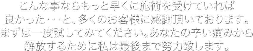病院でたらい回しにされて、結局薬漬けにされ、それでも痛みは改善していない患者さんであれば、施術してもらうことをオススメします。