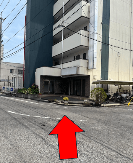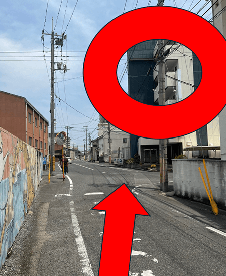 11壁絵を左手に見ながら、直進します。(赤丸の建物が整体院春 岡山院になります。)